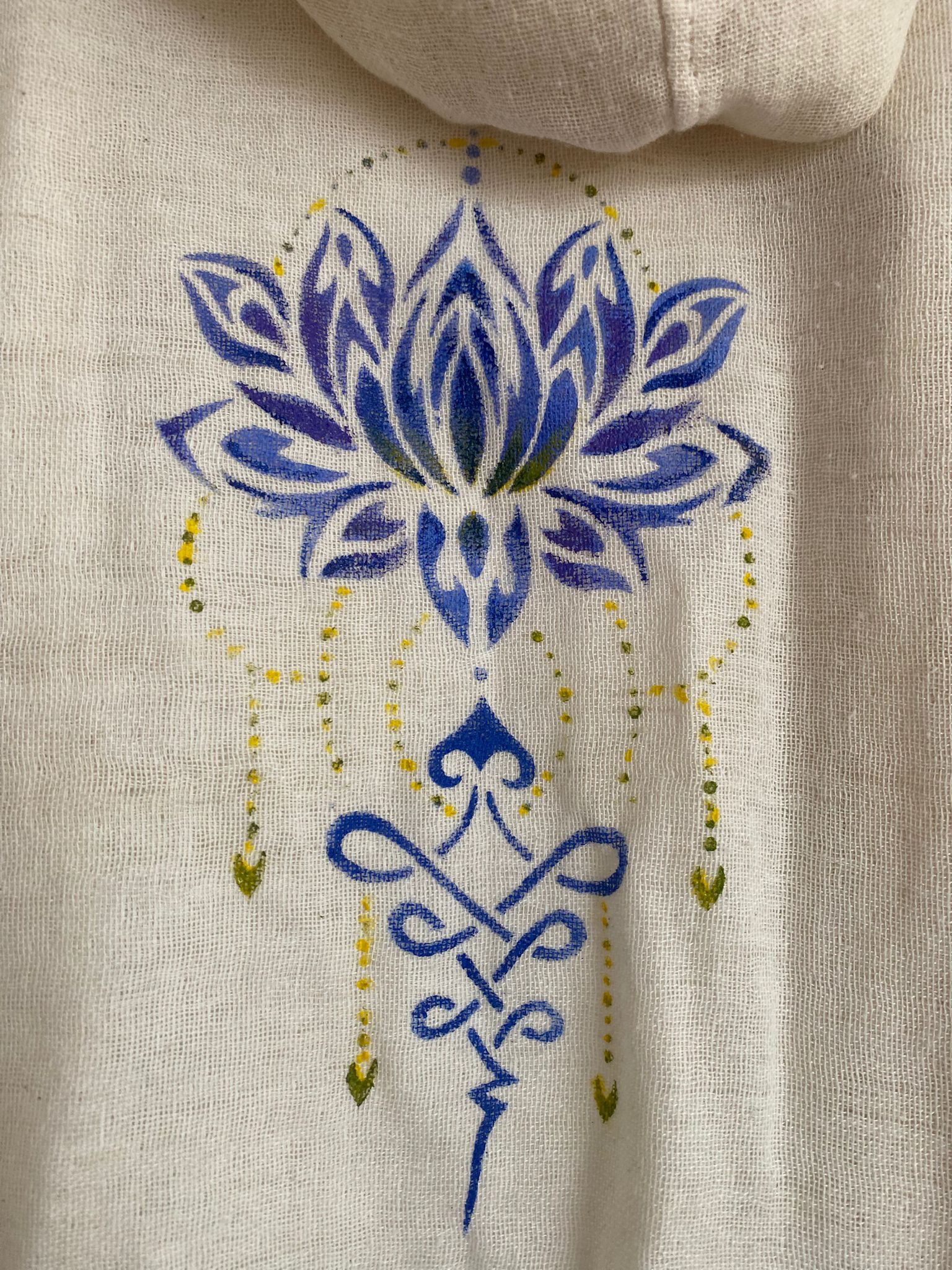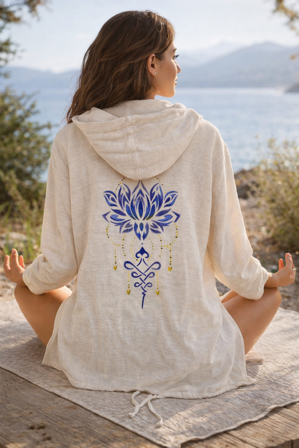 Doğal dokusuyla nefes alan Buldan bezinden üretilen bu özel kimono, sırtındaki lotus deseniyle sade şıklığa anlam katıyor. Hafif yapısı sayesinde yaz aylarında gün boyu konfor sunarken, el boyaması detaylarıyla her parça kendine özgü bir karakter taşır.