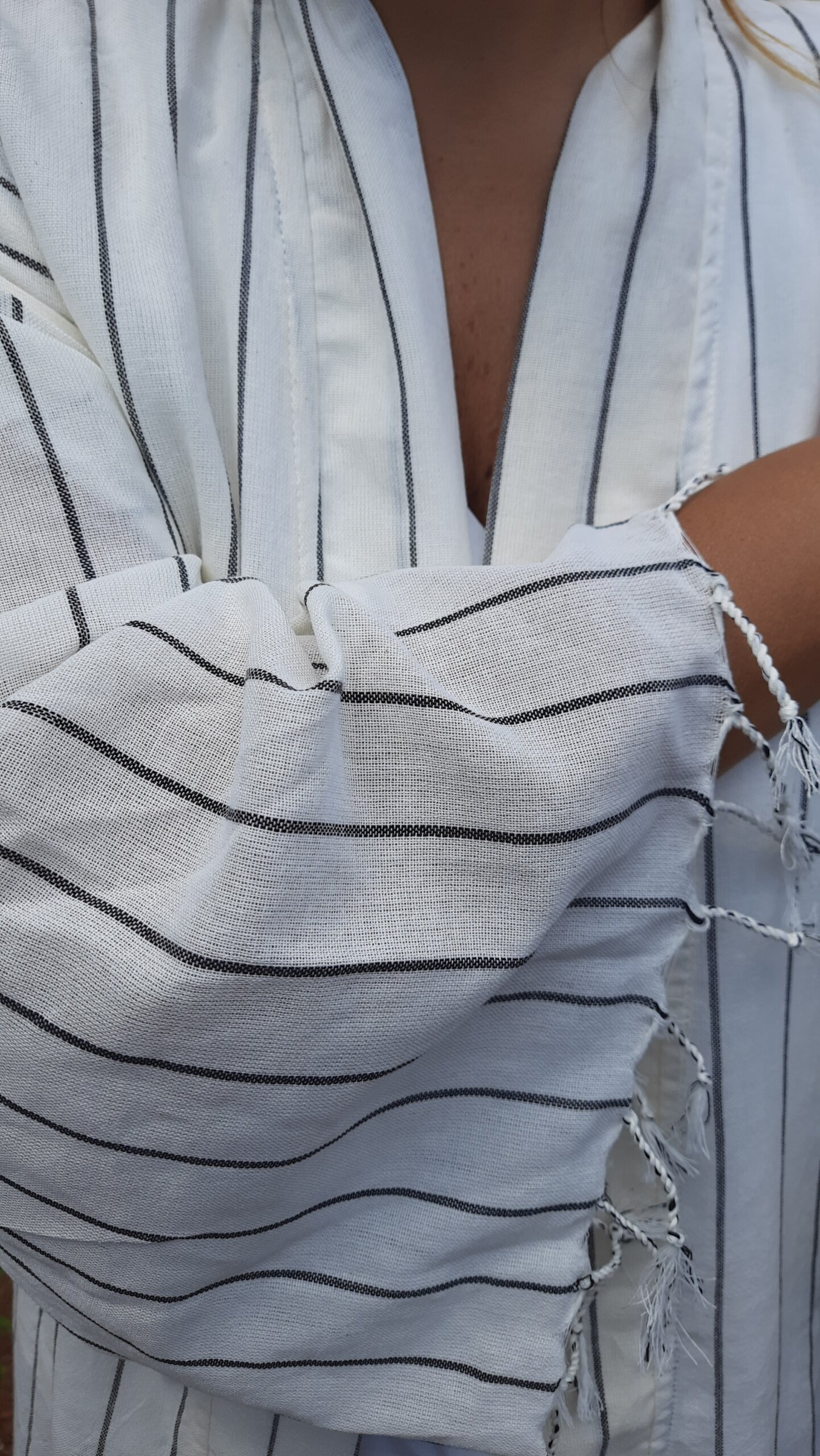 Sorella Atelier koleksiyonunun özgün parçalarından biri olan  bu %100 pamuk çizgili kimono bornoz, doğal tonları ve yüksek kaliteli dokusuyla ev ve plaj stilinize sofistike bir dokunuş katıyor. Hem modern hem de zamansız bir estetik sunan dikey çizgi detayları, silüetinize zarif bir uzunluk kazandırırken bohem ruhunu yansıtıyor.