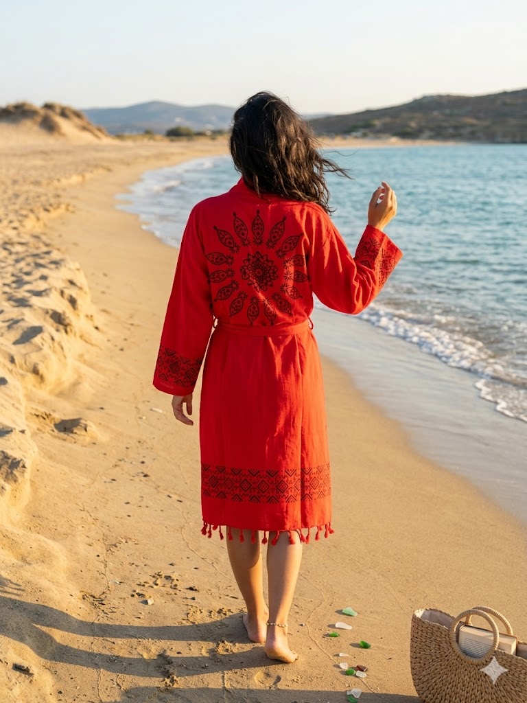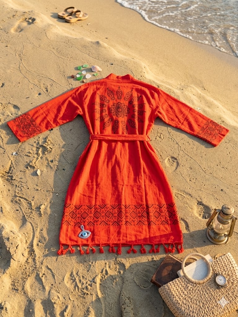 Bu çok yönlü parça, sadece bir bornoz değil; aynı zamanda plajda iddialı bir kaftan veya evde kendinizi özel hissedeceğiniz şık bir sabahlık olarak kullanılabilir.