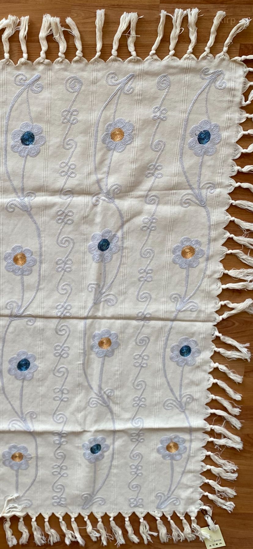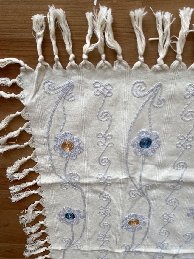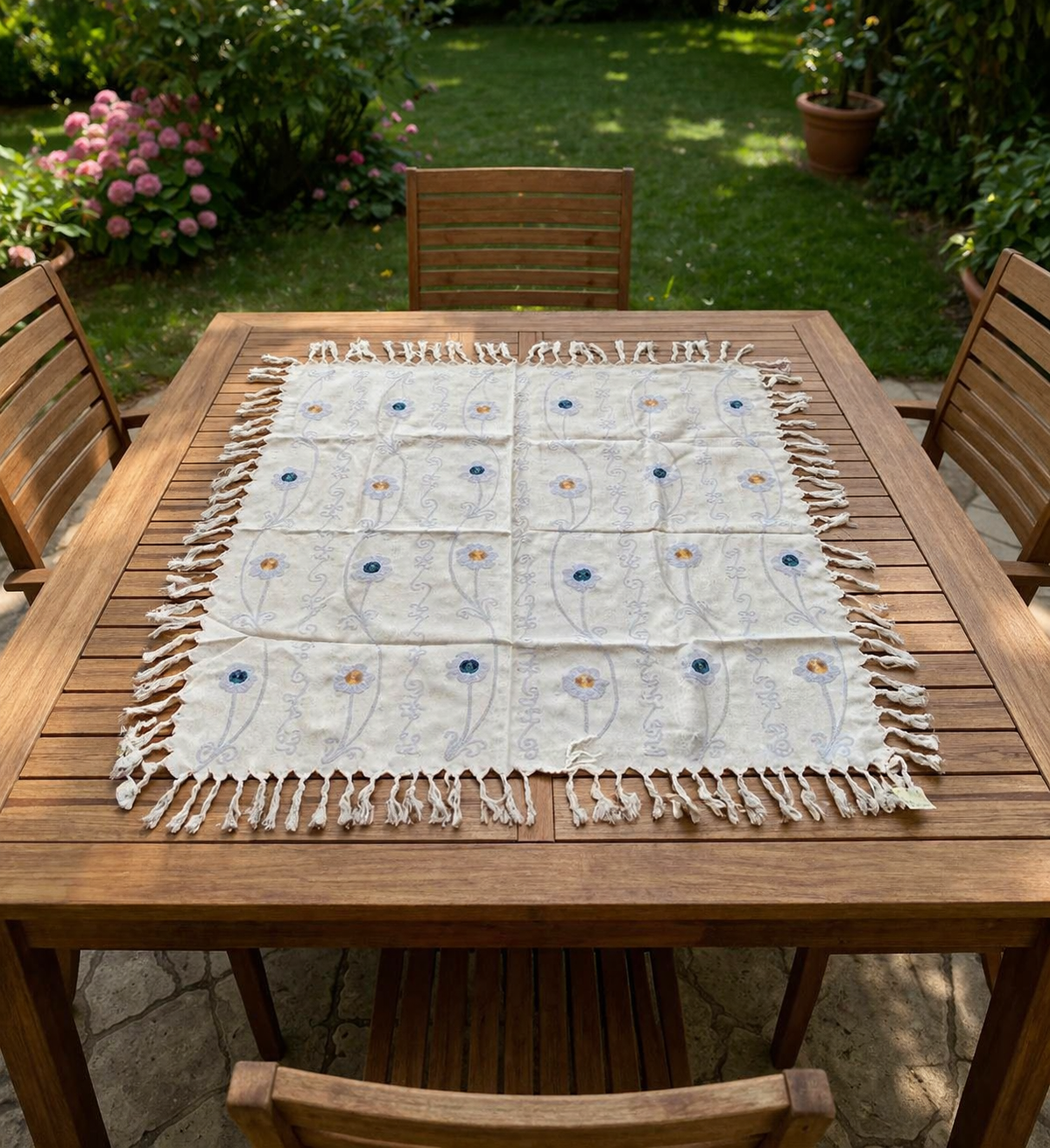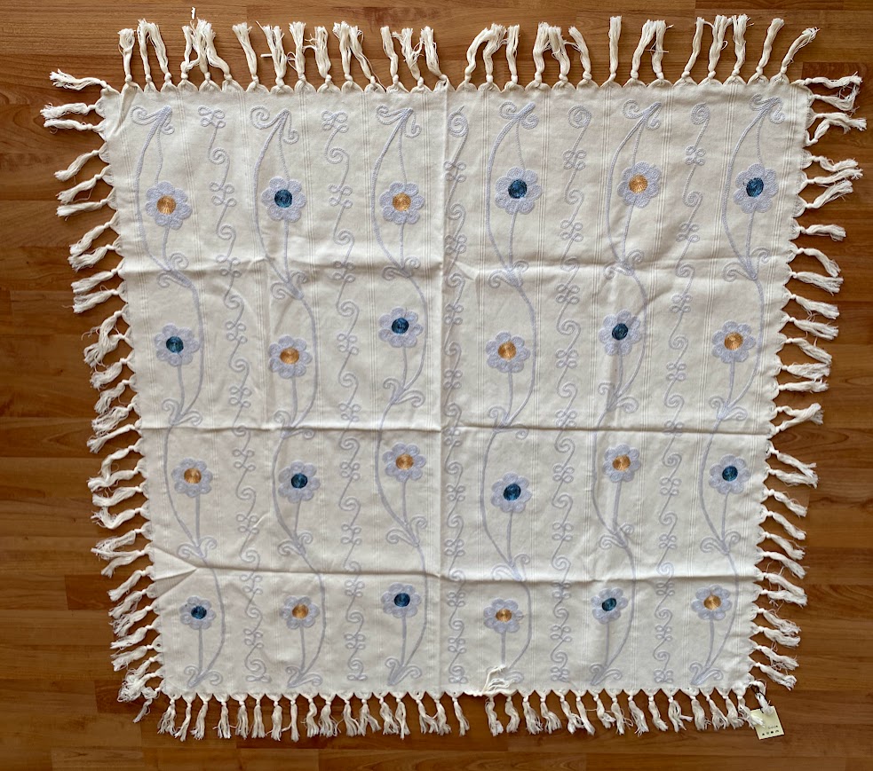 Atelier Sorella dokunuşuyla hayat bulan bu özel masa örtüsü, beyazın saflığını pembe ve mavi çiçeklerin enerjisiyle birleştiriyor. Her bir ilmeği özenle işlenen bu parça, geleneksel el sanatlarını modern sofra düzenine taşıyan zamansız bir sanat eseridir.