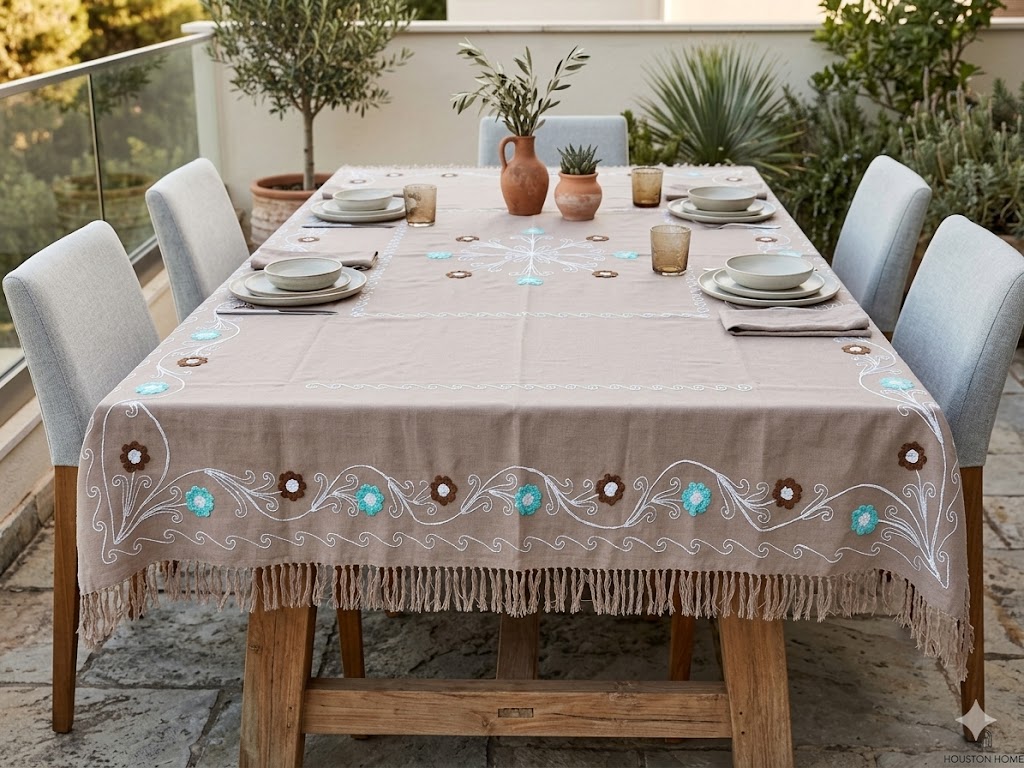 Teras Keyfi ve Zarafet Bir Arada: Papatya Nakışlı Bohem Masa Örtüsü