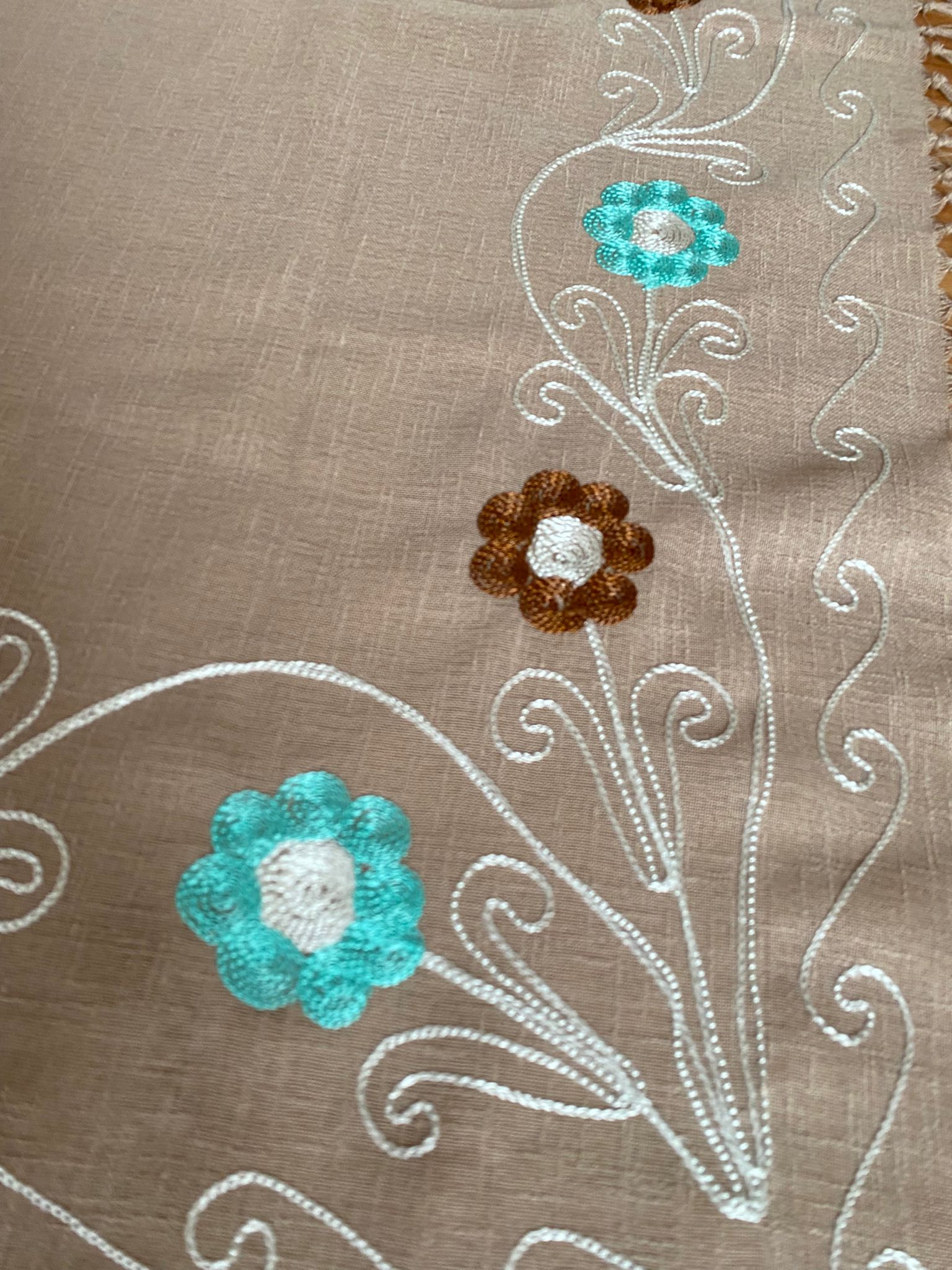 Açık hava sofralarınızı bir sanat eserine dönüştürün! Doğal keten dokusunun verdiği sıcaklığı, turkuaz ve kahve tonlarındaki el işçiliği papatya nakışlarıyla birleştirdik. Hem terasınızdaki ahşap masalara hem de modern bahçe mobilyalarınıza uyum sağlayacak bu örtü, samimi ve şık davetlerin vazgeçilmezi olacak.