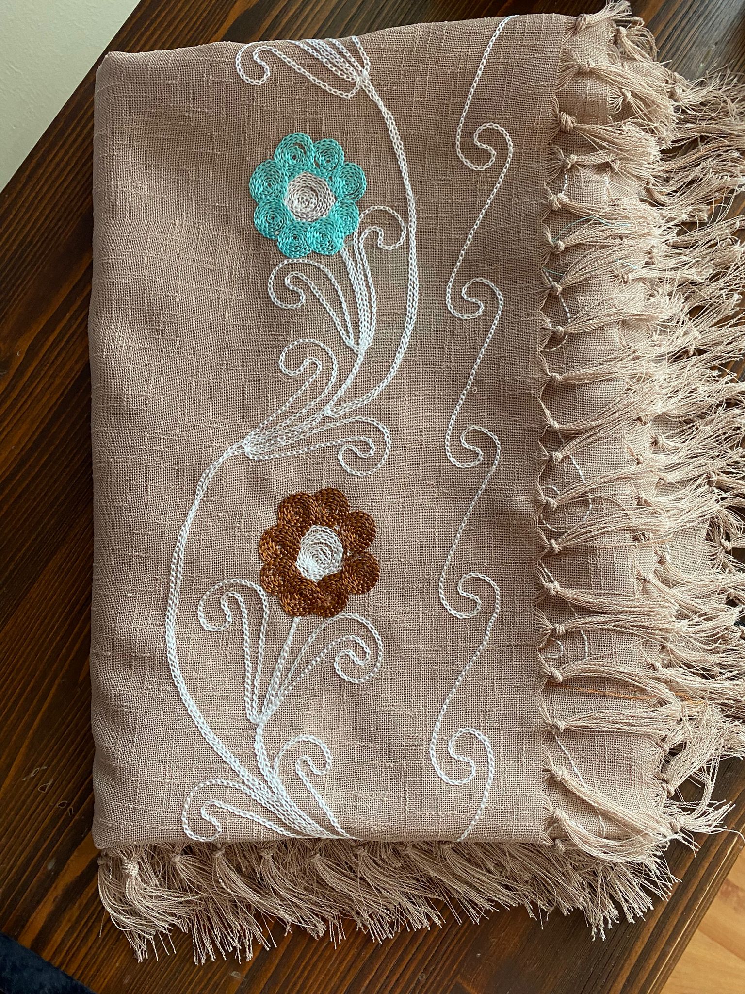 Geleneksel El İşçiliği: Örtünün orta ve kenar kısımlarında yer alan spiral detaylar ve papatya motifleri, titiz bir nakış işçiliğinin eseridir.