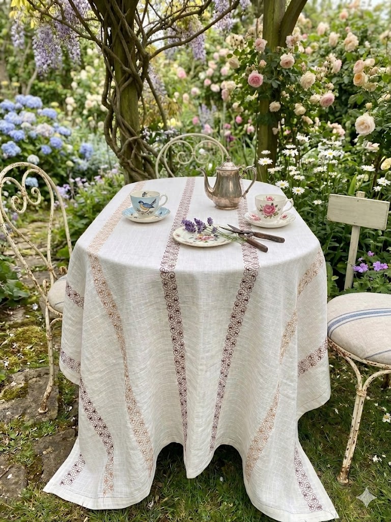 Bu örtü, görseldeki gibi vintage porselenler, gümüş bir demlik ve taze lavanta demetleriyle harika bir uyum sağlar. Eğer daha modern bir görünüm isterseniz, düz renkli toprak kaplar ve hasır Amerikan servislerle de kombinleyebilirsiniz.