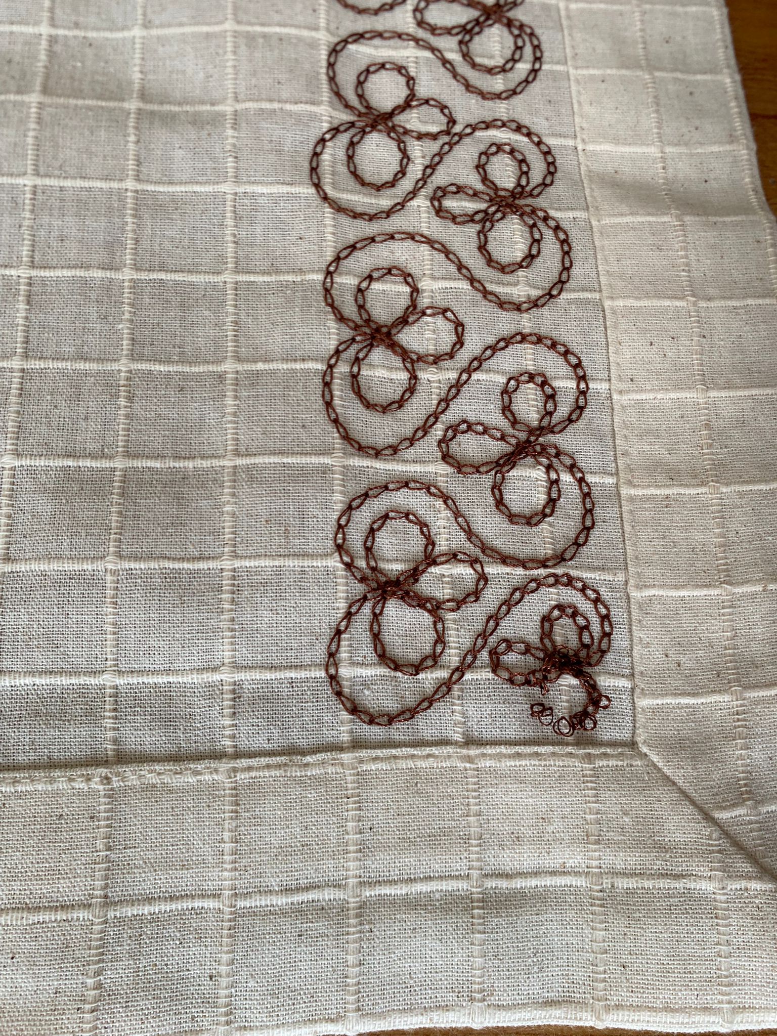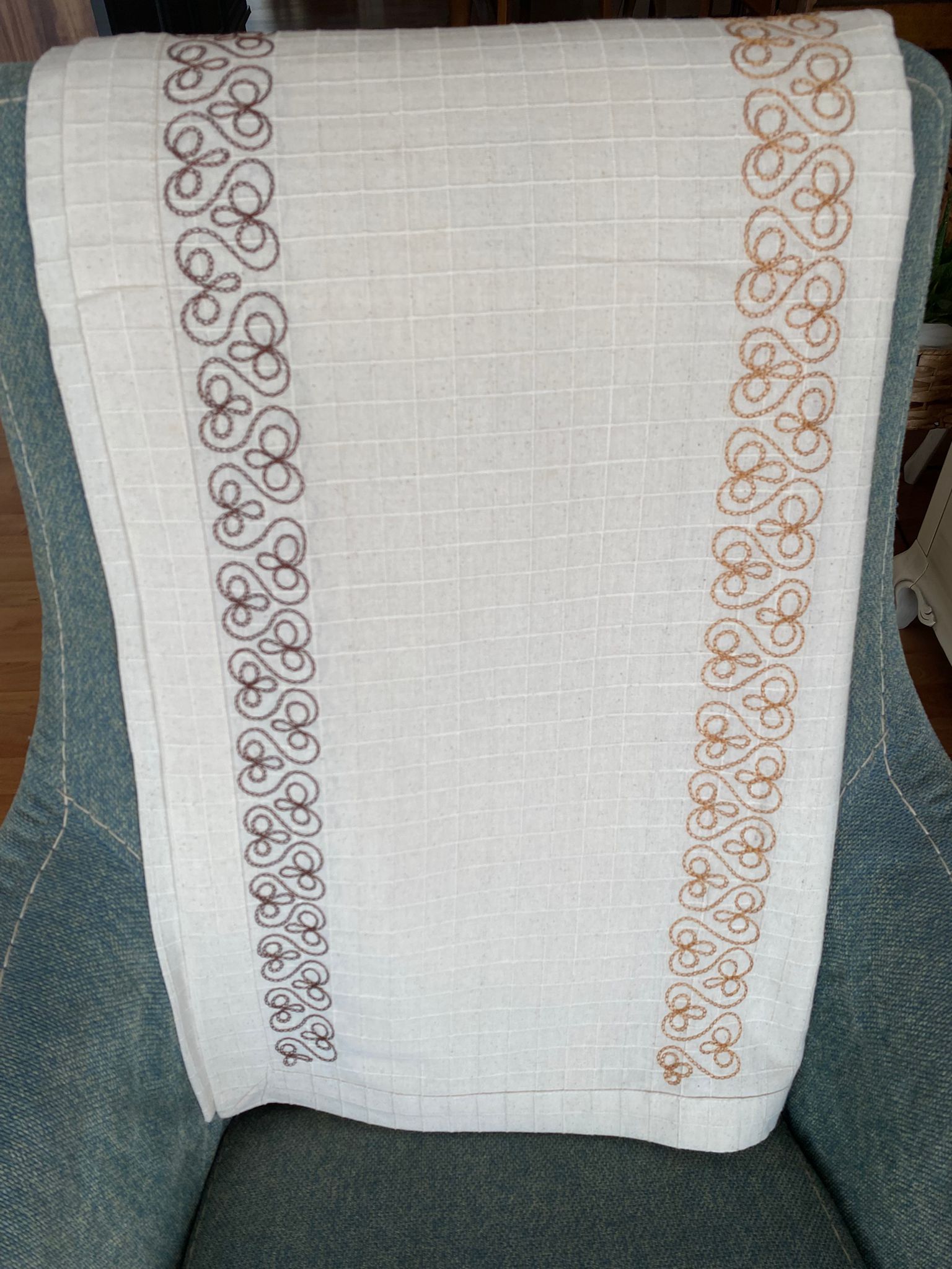 • Zarif Çizgi Nakışlar: Masa boyunca uzanan dikey nakış hatları, sofranıza düzenli ve estetik bir görünüm kazandırır. Nakışlardaki spiral detaylar el işçiliğinin kalitesini yansıtır.